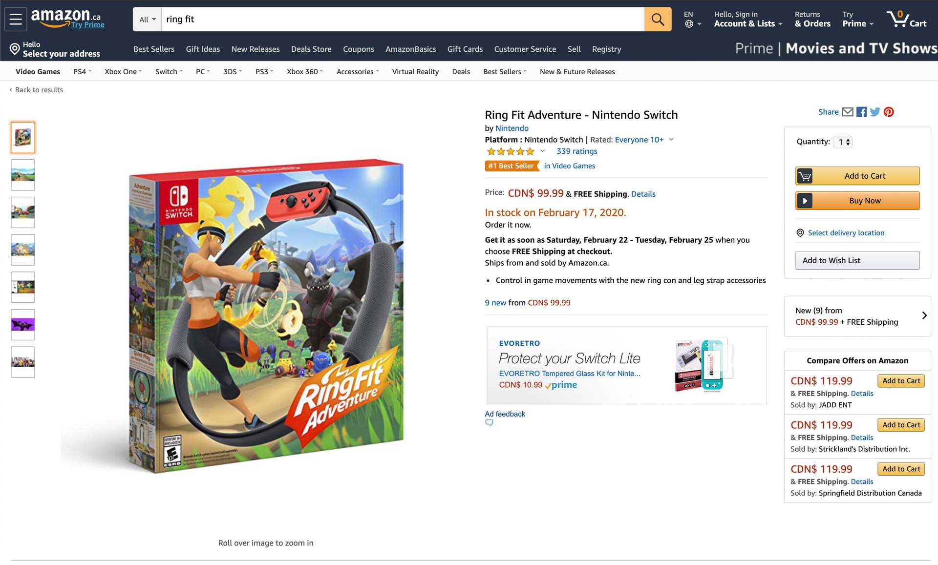 RingFit於加拿大Amazon都只是賣99加幣(Amazon截圖)