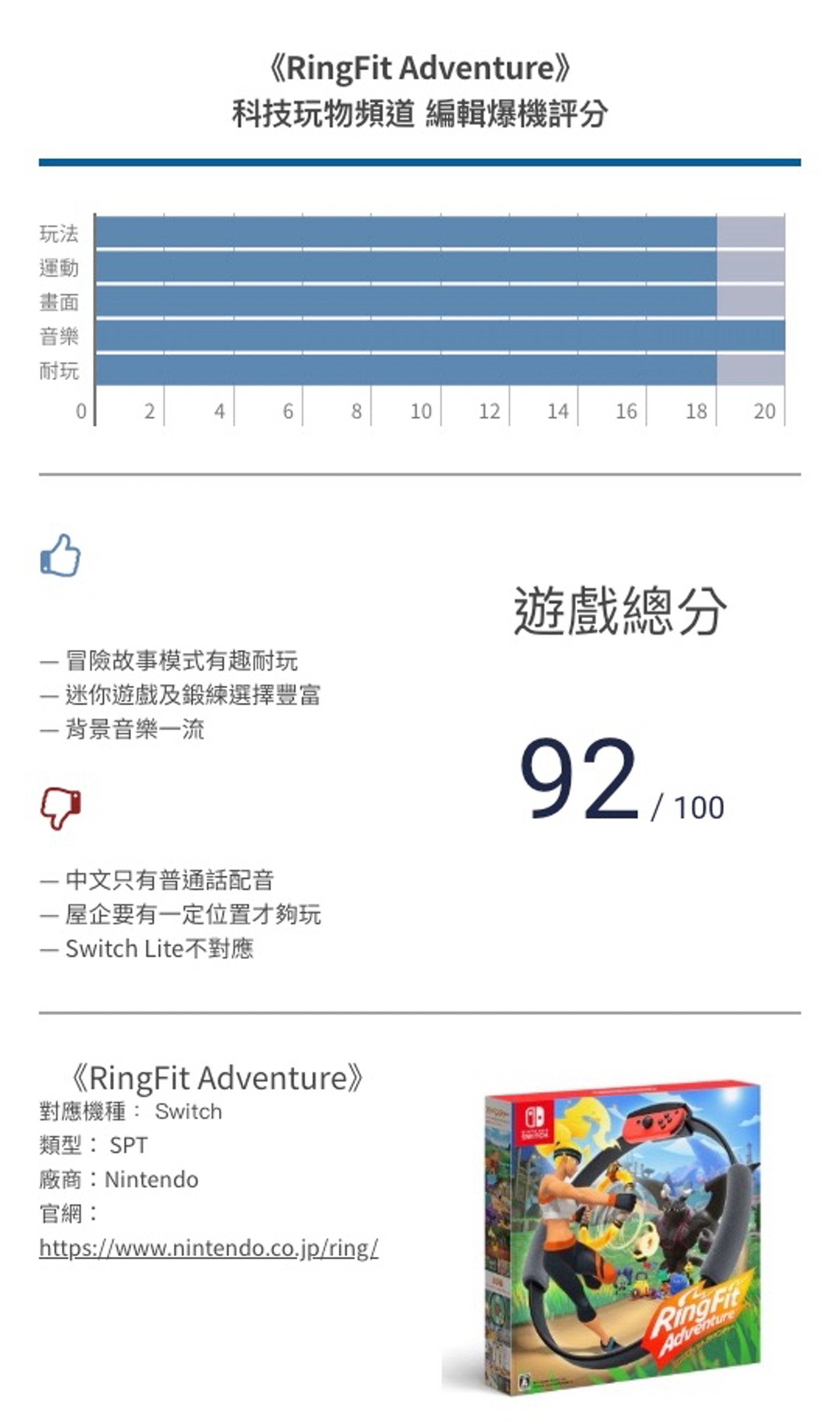 呀脆平日都有做開gym,覺得遊戲鍛鍊的種類都非常多,幾乎全身都可以訓練得到。而且加上利用Ring-con有拉扯的訓練動作,比起昔日Wii Sport或Wii Fit等訓練得更全面。當然,如果與真正的Gym仍有點距離,始終Ring-con難以模擬負重訓練,如果一般「輕度」想玩又想做運動的玩家,就非常適合,但《RingFit Adventure》仍然難以取代一般傳統訓練。