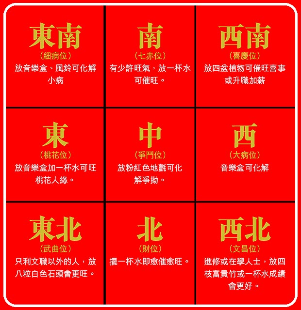 如 你 家 中 的 睡 房 、 工 作 、 梳 化 等 在 這 些 位 置 , 便 會 整 年 受 該 運 程 影 響 , 例 如 睡 房 在 西 面 大 病 位 , 則 容 易 染 上 大 病 , 擺 放 一 個 音 樂 盒 並 不 時 轉 動 便 可 化 解 ; 如 睡 房 在 北 面 財 位 , 則 要 恭 喜 你 , 只 要 擺 杯 水 可 令 財 位 更 旺 。
