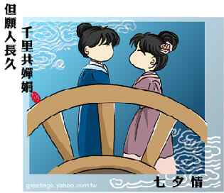 於是每年到了七夕,就有無數的喜鵲飛上天去,搭成了一座鵲橋,讓牛郎、織女一家人渡河相會。因為一年僅能見一次面,當然有說不完的衷曲、道不盡的悲情,於是那天幾乎都會下著毛毛雨,象徵兩人的淚水。